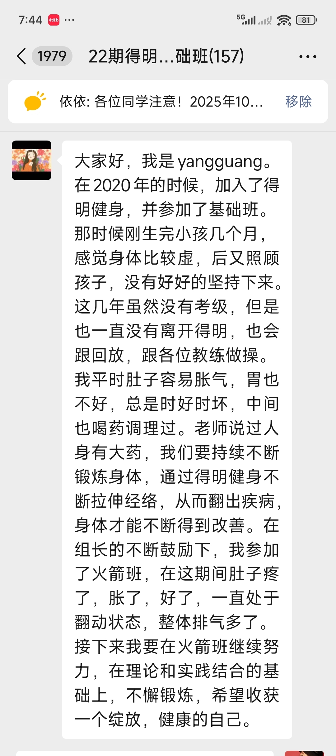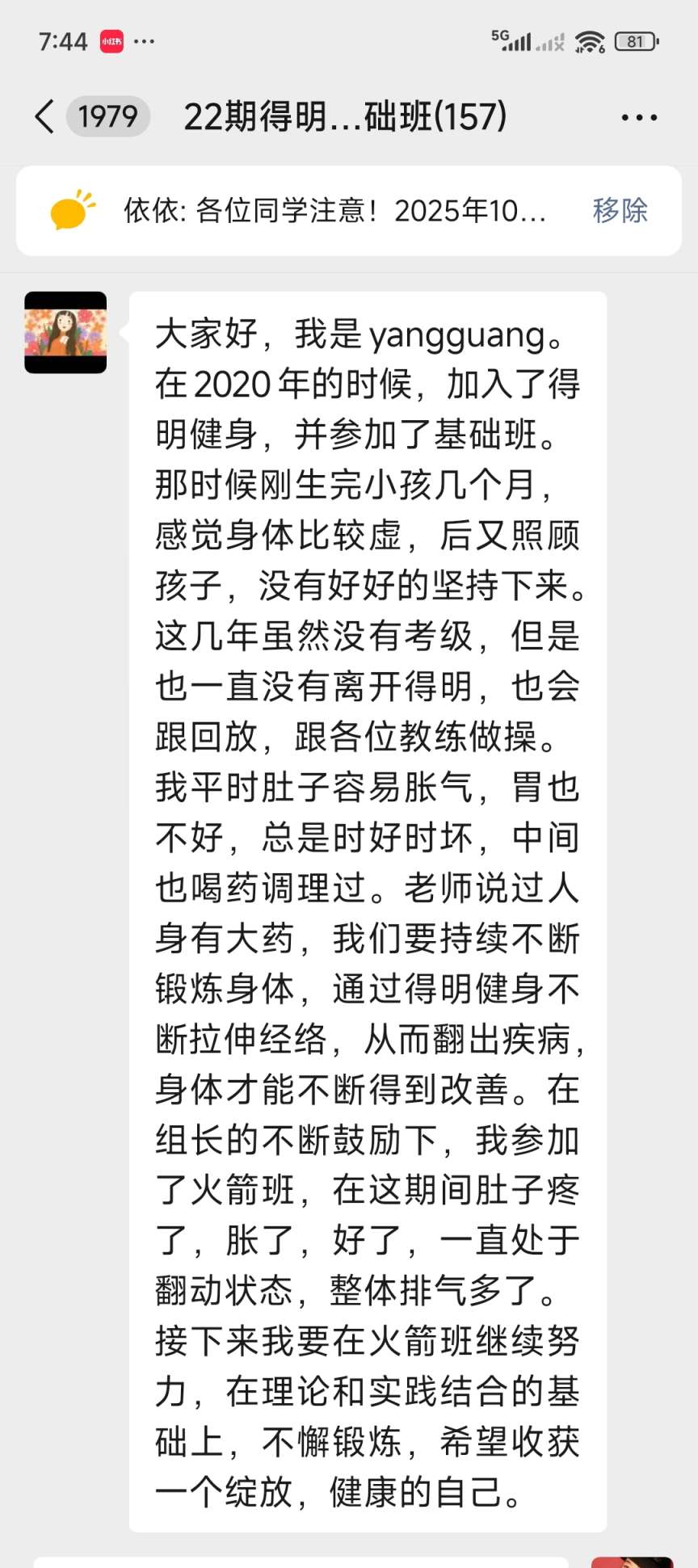 大家好,我是yangguang。在2020年的时候,加入了得明健身,并参加了基础班。那时候刚生完小孩几个月,感觉身体比较虚,后又照顾孩子,没有好好的坚持下来。这几年虽然没有考级,但是也一直没有离开得明,也会跟回放,跟各位教练做操。我平时肚子容易胀气,胃也不好,总是时好时坏,中间也喝药调理过。老师说过人身有大药,我们要持续不断锻炼身体,通过得明健身不断拉伸经络,从而翻出疾病,身体才能不断得到改善。在组长的不断鼓励下,我参加了火箭班,在这期间肚子疼了,胀了,好了,一直处于翻动状态,整体排气多了。接下来我要在火箭班继续努力,在理论和实践结合的基础上,不懈锻炼,希望收获一个绽放,健康的自己。