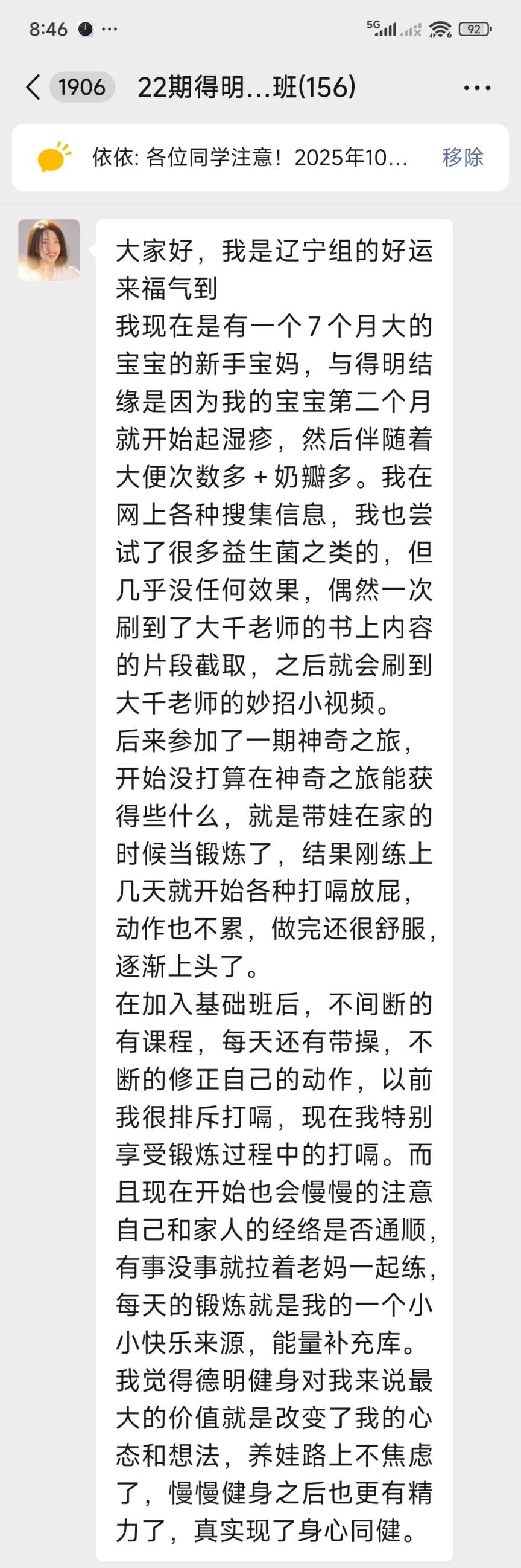 在加入基础班后,不间断的有课程,每天还有带操,不断的修正自己的动作,以前我很排斥打嗝,现在我特别享受锻炼过程中的打嗝。而且现在开始也会慢慢的注意自己和家人的经络是否通顺,有事没事就拉着老妈一起练,每天的锻炼就是我的一个小小快乐来源,能量补充库。