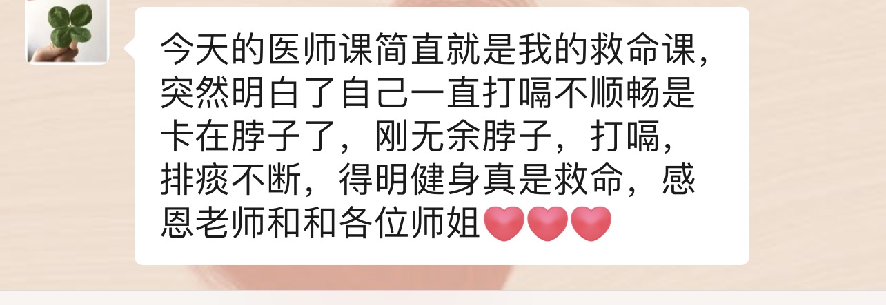 今天的医师课简直就是我的救命课,突然明白了自己一直打嗝不顺畅是卡在脖子了,刚无余脖子,打嗝,排痰不断,得明健身真是救命,感恩老师和和各位师姐[爱心][爱心][爱心]